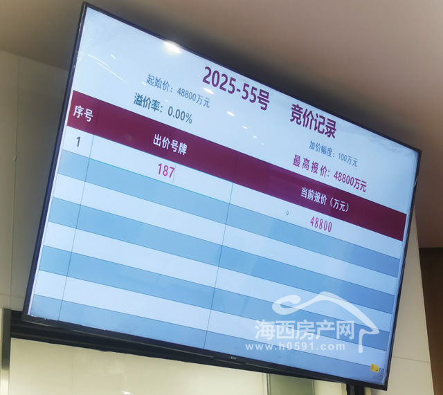 经过1轮竞价,187号竞买人福州建总地产有限公司以底价4.88亿竞得福州宗地2025-55号,楼面地价6611.17元/㎡。