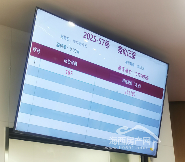 经过1轮竞价,187号竞买人福州建总地产有限公司以10.17亿竞得福州宗地2025-57号,楼面地价12707.79元/㎡。