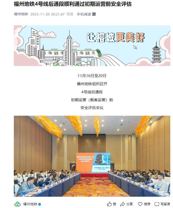 福州地铁将针对专家组评审意见,逐项落实,全力保障4号线后通段高标准开通,早日为市民提供安全、便捷、舒适的出行服务。