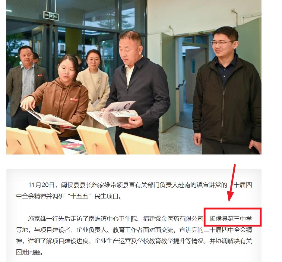 施家雄一行先后走访了南屿镇中心卫生院、福建紫金医药有限公司、闽侯县第三中学等地,与项目建设者、企业负责人、教育工作者面对面交流,宣讲党的二十届四中全会精神,详细了解项目建设进度、企业生产运营及学校教育教学提升等情况,并协调解决有关困难问题。