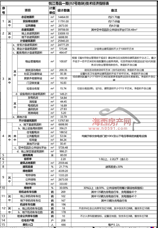 悦江尊品一期总平图显示,项目占地约21.70亩,实际用地面积约17.69亩,总建筑面积39708㎡,住宅计容面积24777.29㎡,规划住宅总户数208户,居住人口666人。