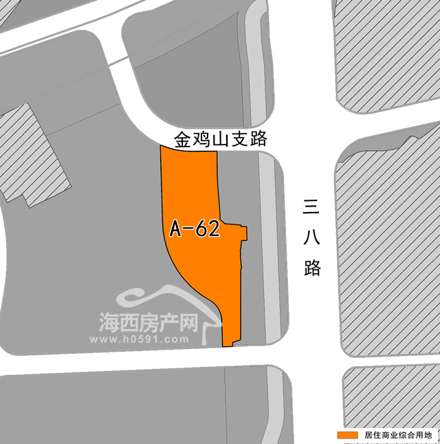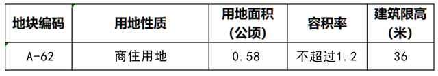 晋安区350111-TT-A管理单元A-62地块位于晋安区三八路西侧,金鸡山支路南侧,用途为商住用地,用地面积0.58公顷(8.7亩),容积率不超过1.2,建筑限高36米。