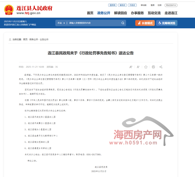 海西房产网(微信公众号:fjhxfcw)消息:11月21日, 连江县民政局发布“关于《行政处罚事先告知书》送达公告”。