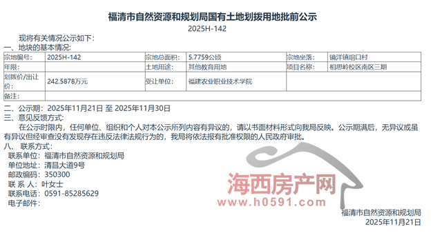 海西房产网(微信公众号:fjhxfcw)消息:11月21日,福清市自然资源和规划局发布一则国有土地划拨用地批前公示。