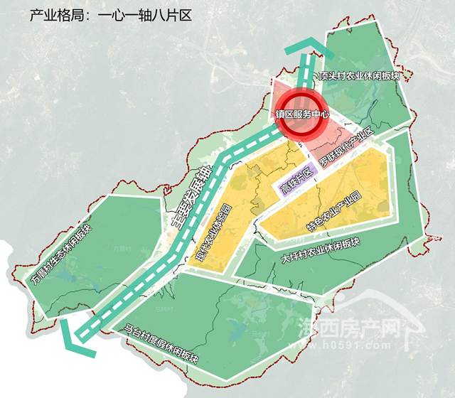 八区 : 罗联现代产业区、高铁枢纽片区、现代农业体验区、特色农业体验区以及以顶头、方厝、马台、大坪为代表的生态农业休闲片区。
