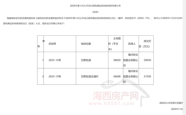 海西房产网(微信公众号:fjhxfcw)消息:继11月21日,公布闽侯宗地2025-12号出让结果之后,闽侯县公共资源交易服务中心也揭晓了宗地2025-13号竞买人。