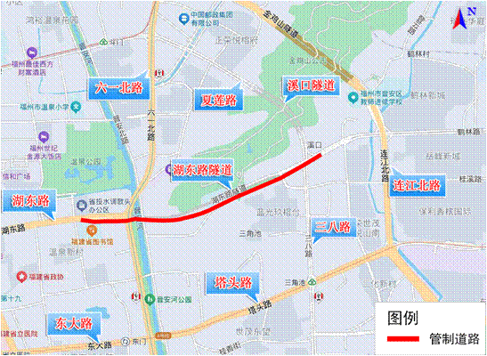 经福州市市政工程中心申请,因湖东路隧道维护施工需要,根据《中华人民共和国道路交通安全法》第三十九条规定,决定从2025年11月24日至施工结束(工期约1个月),每日23时至次日6时,对湖东路隧道西往东方向(鼓楼往晋安)道路实施临时交通管制,禁止机动车通行。