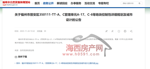 海西房产网(微信公众号:fjhxfcw)消息:11月24日,福州市自然资源和规划局发布“关于福州市晋安区350111-TT-A、C管理单元A-17、C-6等地块控制性详细规划及城市设计的公告”。
