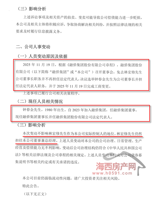 另外,融侨集团免去林宏修董事长职务,选举钟春金为新董事长并担任法定代表人。此次人事变动后,林宏修仍保持实际控制人地位,公告明确其职务变更对公司治理、日常管理及生产经营无不利影响。