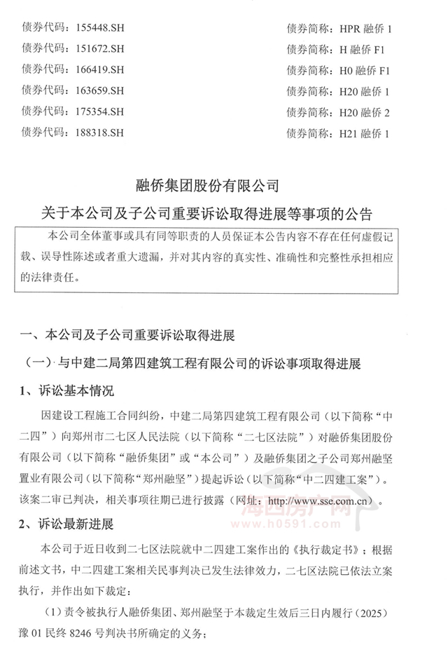 公告显示,融侨集团及子公司涉及的中二四建工案二审已判决,执行裁定书已下达,要求融侨集团及子公司履行判决义务,涉及金额7391.18万元及利息。执行措施包括冻结、扣划银行存款或查封、扣押、冻结、提取相应价值的其他资产。