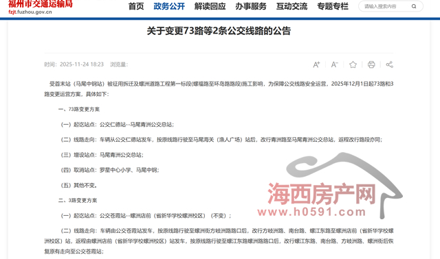 11月24日,福州市道路运输事业发展中心发布“关于变更73路等2条公交线路的公告”。
