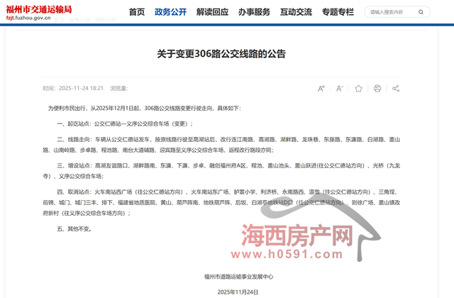 2025年11月24日,福州市道路运输事业发展中心发布“关于变更306路公交线路的公告”。