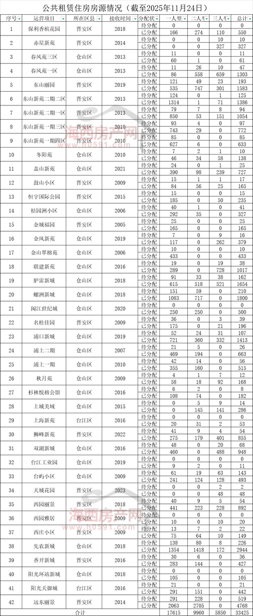 截至2025年11月24日,福州运营的公租房项目共有42个,其中仓山区44个、晋安区36个、台江区4个。合计房源33425套。其中,一人型房源17615套、二人型房源9960套、三人型房源5850套。