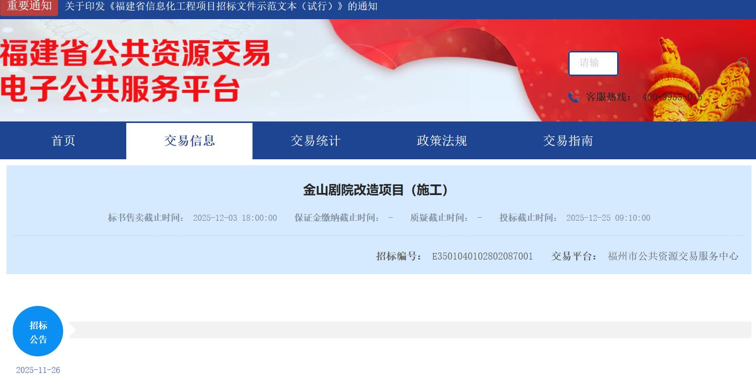 2025年11月26日,福州市公共资源交易服务中心发布“金山剧院改造项目(施工)”。