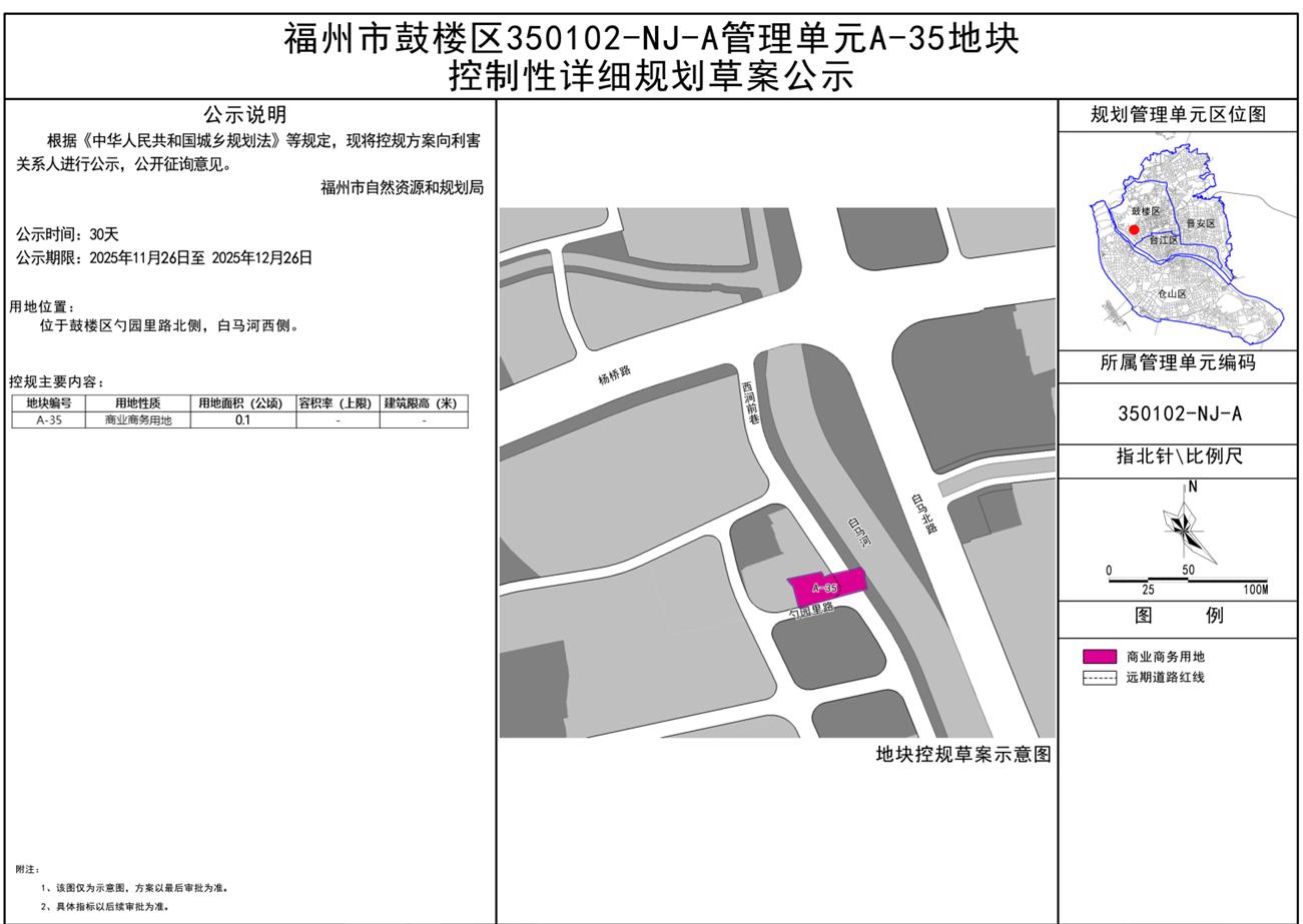 鼓楼区350102-NJ-A管理单元A-35地块位于鼓楼区南街片区,南至勺园里路,东邻白马河。该控规草案经研究审议,根据《中华人民共和国城乡规划法》等相关规定,现广泛征求社会各界意见,公示时间2025年11月26日至2025年12月26日,详情可查阅网站(http://zygh.fuzhou.gov.cn)。