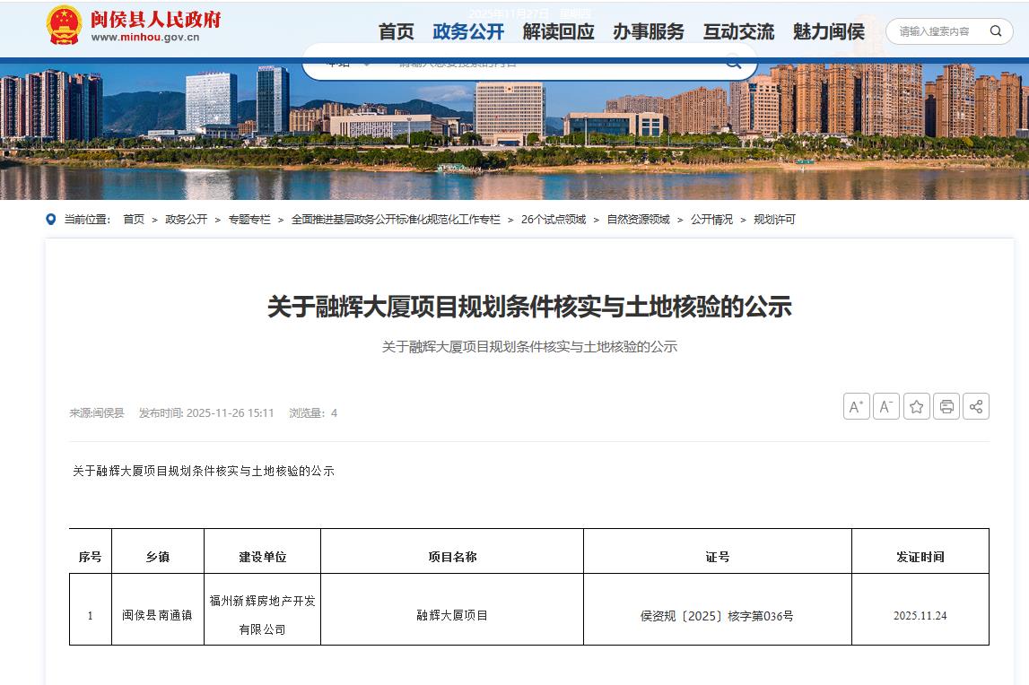 融辉大厦项目,位于闽侯县南通镇,建设单位福州新辉房地产开发有限公司,证号:侯资规〔2025〕核字第036号,发证时间2025年11月24日。