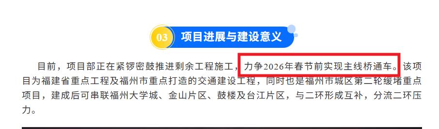 目前,项目部正在紧锣密鼓推进剩余工程施工,力争2026年春节前实现主线桥通车。该项目为福建省重点工程及福州市重点打造的交通建设工程,同时也是福州市城区第二轮缓堵重点项目,建成后可串联福州大学城、金山片区、鼓楼及台江片区,与二环形成互补,分流二环压力。