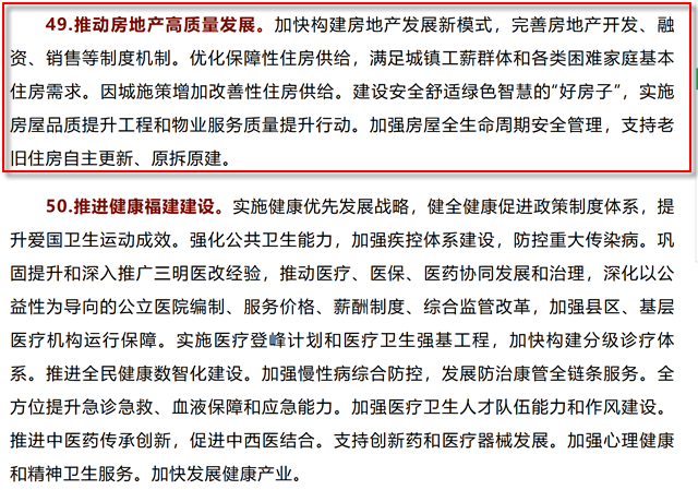建设安全舒适绿色智慧的“好房子”,实施房屋品质提升工程和物业服务质量提升行动。加强房屋全生命周期安全管理,支持老旧住房自主更新、原拆原建。