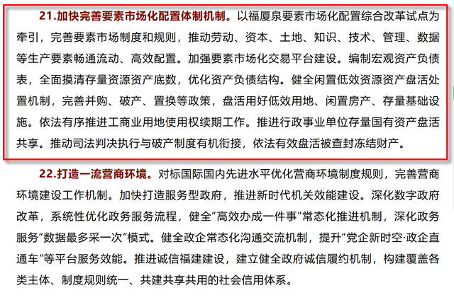 以福厦泉要素市场化配置综合改革试点为牵引,完善要素市场制度和规则,推动劳动、资本、土地、知识、技术、管理、数据等生产要素畅通流动、高效配置。