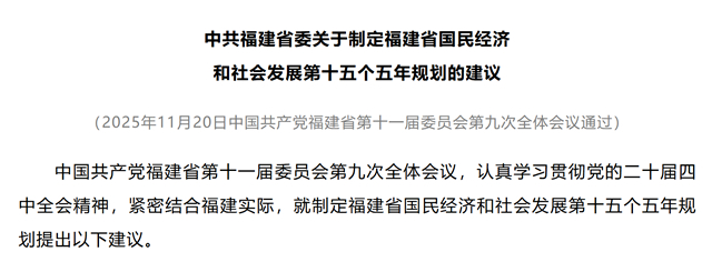 海西房产网(微信公众号:fjhxfcw)消息:11月28日,中共福建省委发布“关于制定福建省国民经济和社会发展第十五个五年规划的建议”。