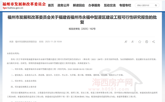 海西房产网(微信公众号:fjhxfcw)消息:11月28日,福州市发展和改革委员会发布“关于福建省福州市永福中型灌区建设工程可行性研究报告的批复(榕发改审批〔2025〕162号)”。