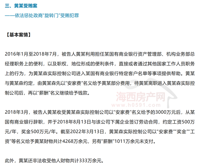 2018年3月,被告人黄某收受黄某森实际控制公司以“安家费”名义给予的3000万元后,从某国有商业银行辞职,并于2018年8月13日与该公司下属企业签订劳动合同,约定工资500万元/年,奖金500万元/年。截至2022年3月13日,黄某森实际控制公司以“安家费”“奖金”“工资”等名义给予黄某财物共计4268万余元,另有“薪酬”1011万余元未支付。