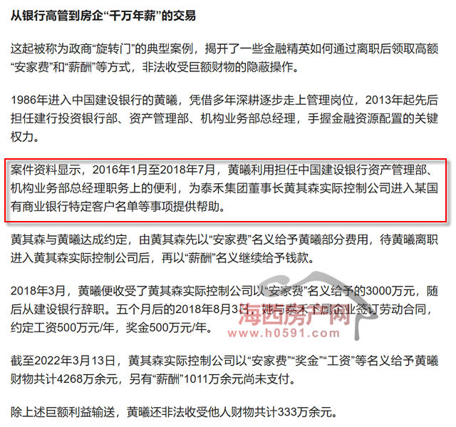 其中,披露了中国建设银行机构业务部原总经理、泰禾集团原执行副总裁黄曦受贿案详情。