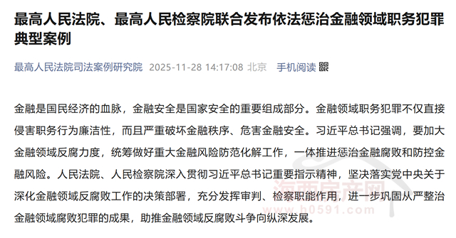 海西房产网(微信公众号:fjhxfcw)消息:11月28日,最高人民法院、最高人民检察院合发布依法惩治金融领域职务犯罪6件典型案例。