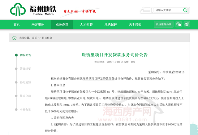 公告明确,福州地铁置业有限公司就璟琇里项目开发贷款服务进行公开询价。