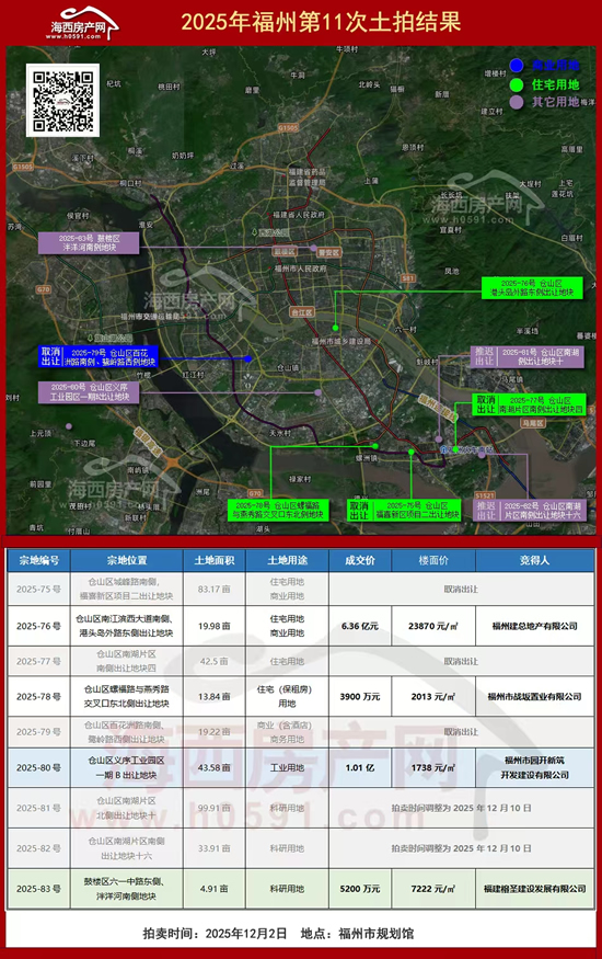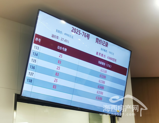最终,经过138轮竞价,83号竞买人福州建总地产有限公司更胜一筹,以6.36亿竞得福州宗地2025-76号,楼面地价23870.28元/㎡。