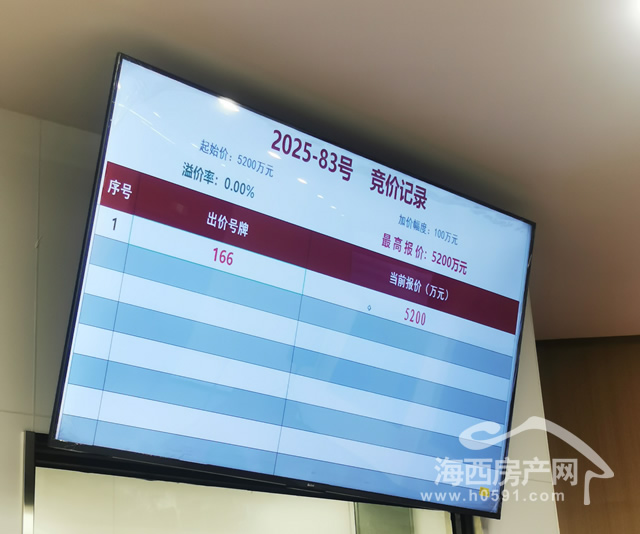经过1轮竞价,166号竞买人福建榕圣建设发展有限公司以底价5200万竞得福州宗地2025-83号,楼面地价7221.62元/㎡。