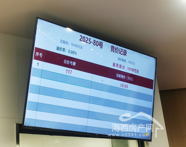 经过1轮竞价,117号竞买人福州市园开新筑开发建设有限公司以底价10100万竞得福州宗地2025-80号,楼面地价1738.20元/㎡。