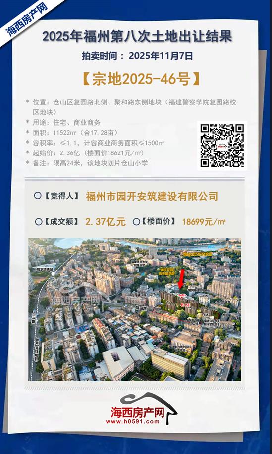 其中,经过2轮竞价,司以23700万元竞得福州宗地2025-46号,楼面地价18699.40元/㎡。