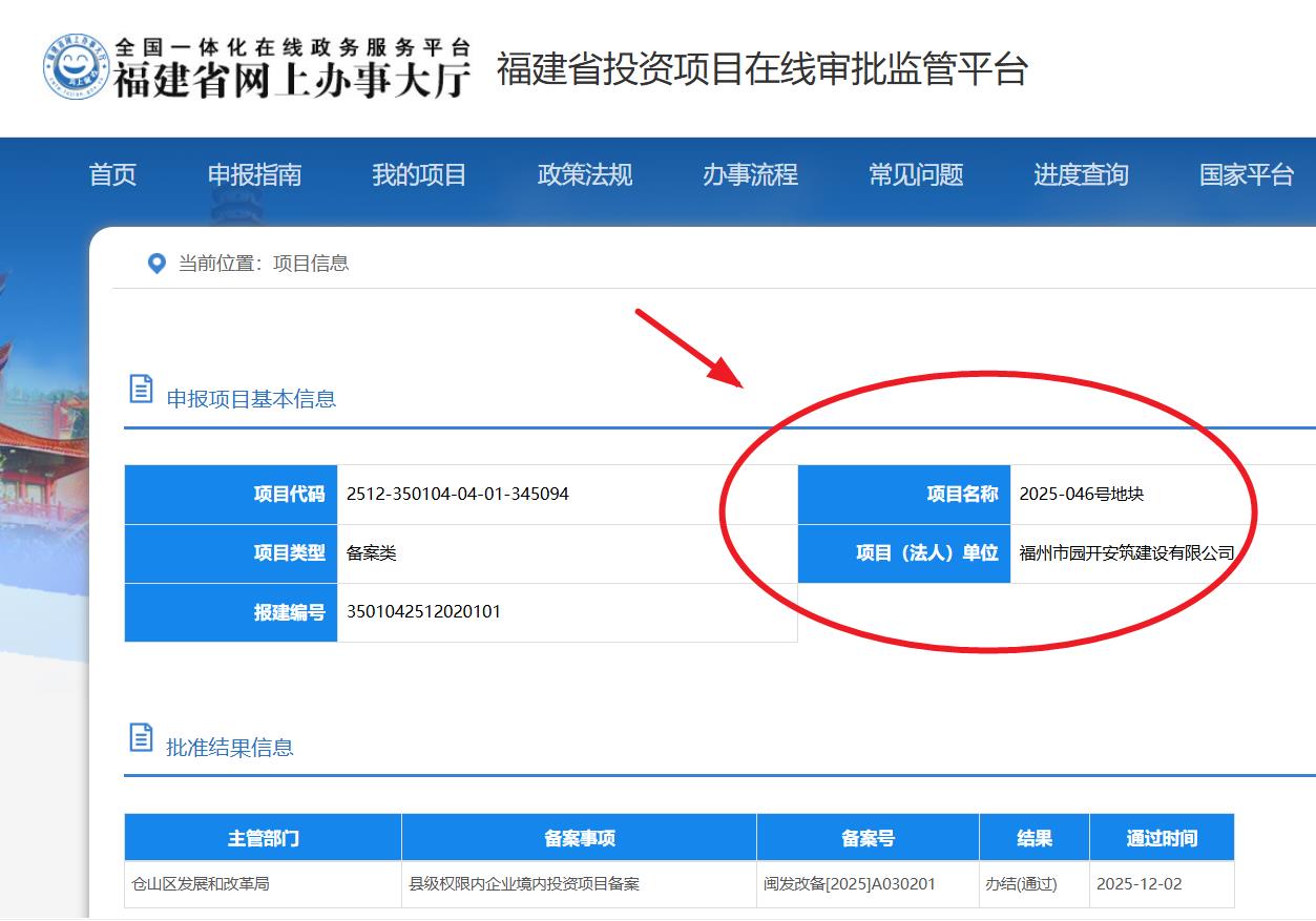 海西房产网(微信公众号:fjhxfcw)消息:福建省投资项目在线审批监管平台发布信息显示,“2025-046号地块”已于12月2日取得县级权限内企业境内投资项目备案,批准结果信息为办结(通过)。