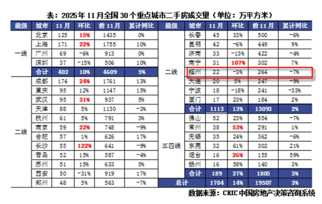 作为二线城市的福州,11月二手房成交22万㎡,环比10月下降3%,前11月累计成交264万㎡,与2024年同期相比下降7%。