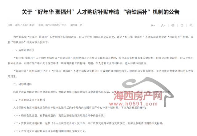 海西房产网(微信公众号:fjhxfcw)消息:12月2日,福州市国有房产中心发布“关于“好年华 聚福州”人才购房补贴申请‘容缺后补’机制的公告”。