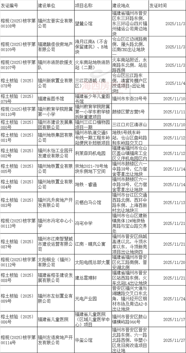 海西房产网(微信公众号:fjhxfcw)消息:2025年12月1日,福州市自然资源和规划局公布“2025年11月份建设项目竣工条件核实结果发放情况”。
