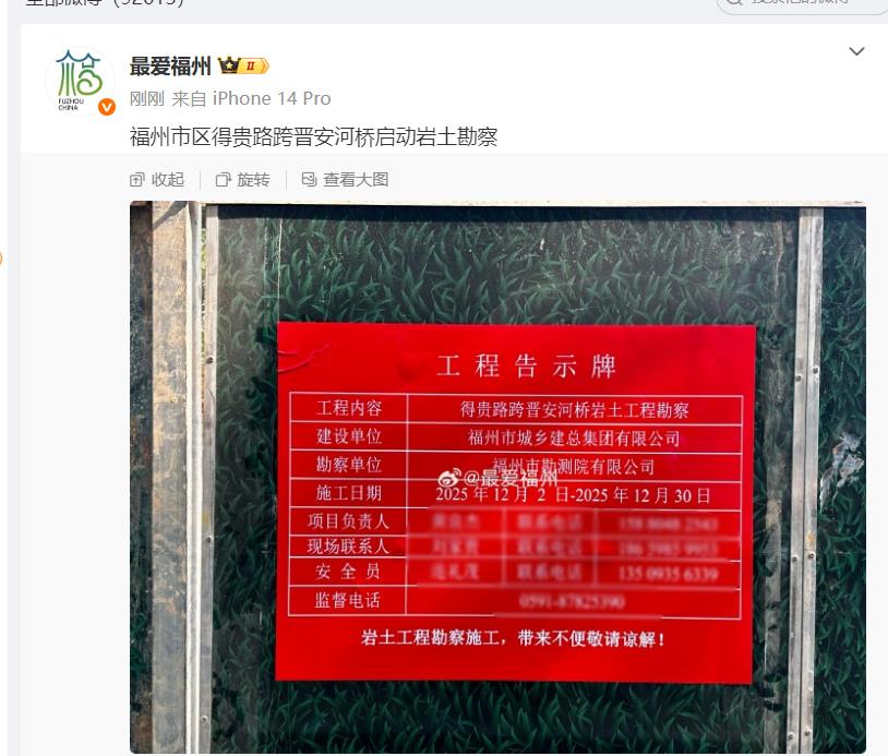根据公布的“得贵路跨晋安河桥启动岩土勘察工程告示牌”,该项目建设单位 为福州市城乡建总集团有限公司,勘察单位为福州市勘测院有限公司。施工日期从2025年12月2日至2025年12月30日。随着工程勘察的启动,也意味着项目离正式开工不远了。