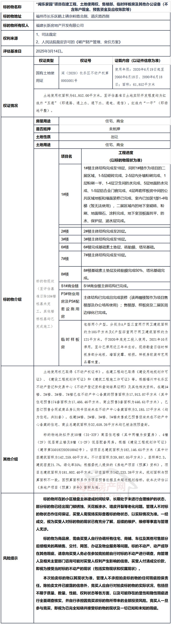 本次拍卖的标的为福建长新房地产开发有限公司名下所有位于福州市长乐区鹤上镇京岭路北侧、道庆路西侧的“闽乐家园”项目土地使用权与地面在建工程(含售楼部等其他办公资产,不包括债务人账户内现金资产以及商品房预售资金及应收账款等)。