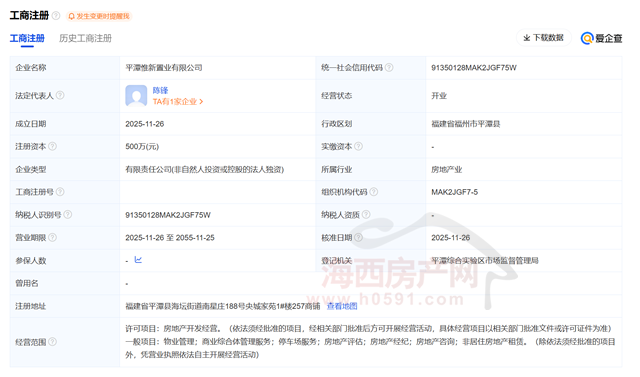 爱企查资料显示,平潭惟新置业有限公司成立于2025年11月26日,注册地位于福建省平潭县海坛街道南星庄188号央城家苑1#楼257商铺,法定代表人为陈锋。