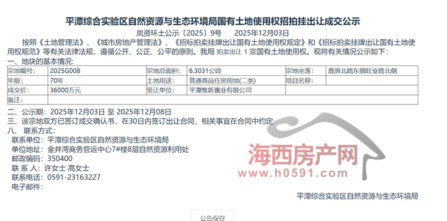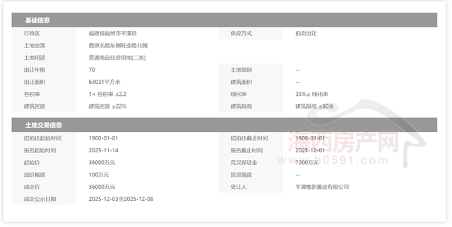 最终,平潭惟新置业有限公司以底价36000万元竞得平潭2025G008地块,按容积率上限2.2测算,得出该地块成交楼面价为2596.12元/㎡。