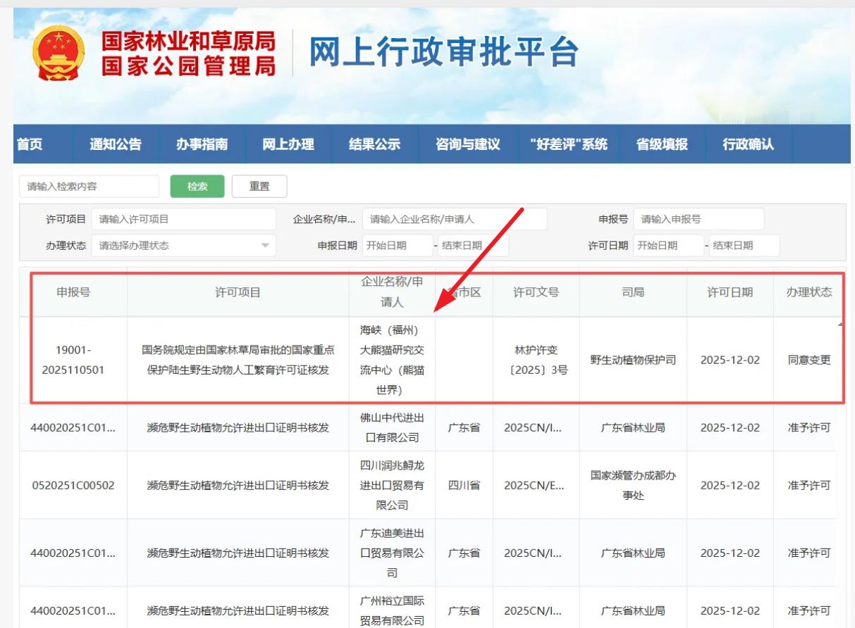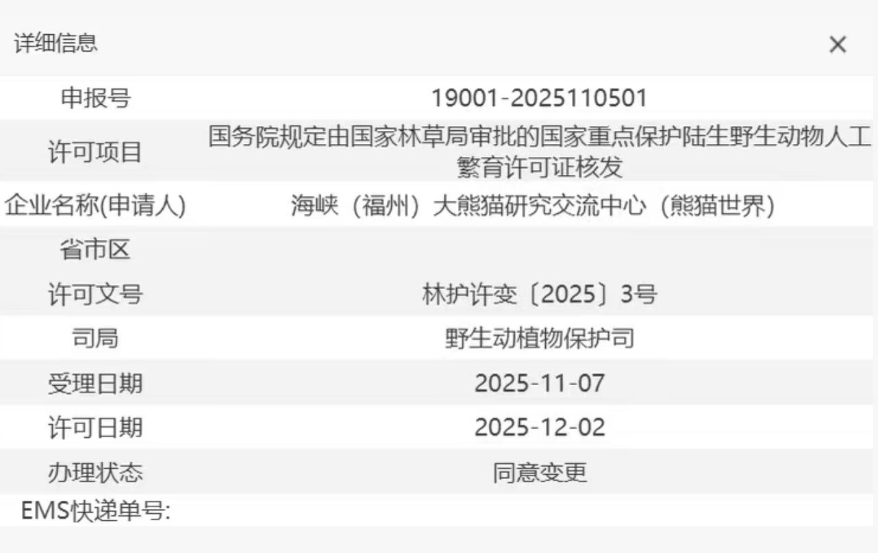 据“国家林业和草原局”网上行政审批平台显示,海峡(福州)大熊猫研究交流中心(熊猫世界)已取得国家务规定由国家林草局审批的国家重点保护陆生野生动物人工繁育许可证核发。许可文号林护许变【2025】3号,许可日期为2025年12月2日,办理状态为同意变更。