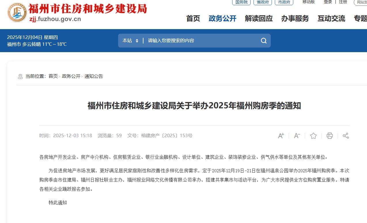 海西房产网(微信公众号:fjhxfcw)消息:2025年12月2日,福州市住房和城乡建设局发布“关于举办2025年福州购房季的通知”。