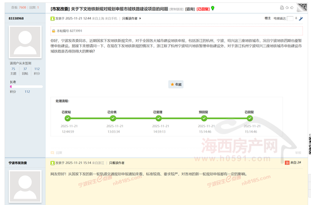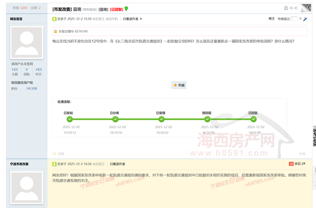 海西房产网(微信公众号:fjhxfcw)消息:近日,有网友在浙江宁波市网络民生服务平台“民生e点通”留言咨询,“梅山支线当初不是包含在12号线中,在《长三角多层次轨道交通规划》一起批复立项的吗?怎么现在还要重新走一遍国家发改委的审批流程?是什么情况?”