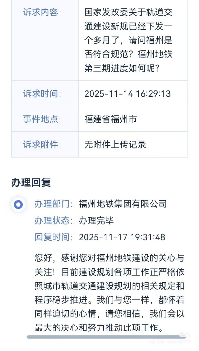 11月17日,福州地铁集团在回答相关咨询时再次表示:目前建设规划各项工作正严格依照城市轨道交通建设规划的相关规定和程序稳步推进。我们与您一样,都怀着同样迫切的心情,请您相信,我们会以最大的决心和努力推动此项工作。