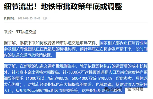根据此前公众号“RT轨道交通”发文透露,国家相关部委正在与行业协会及相关专业团队正在做最后的标准协商,预计年底左右将会发布接下来一段时间内的轨道交通审批政策依据。