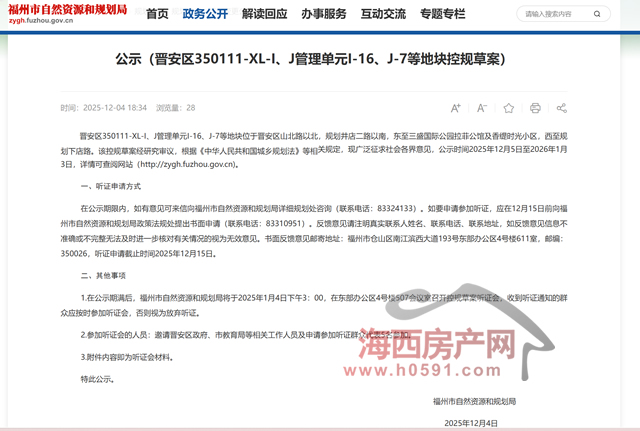 海西房产网(微信公众号:fjhxfcw)消息:12月4日, 福州市自然资源和规划局发布“晋安区350111-XL-I、J管理单元I-16、J-7等地块控规草案公示”。