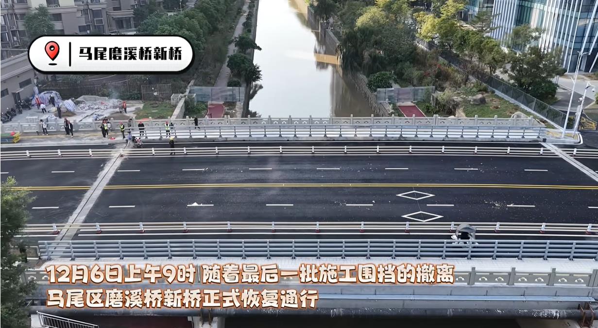 这座横跨磨溪的桥梁在经历临时拆除、提升改造后,以全新面貌重新融入马尾城市交通网络。