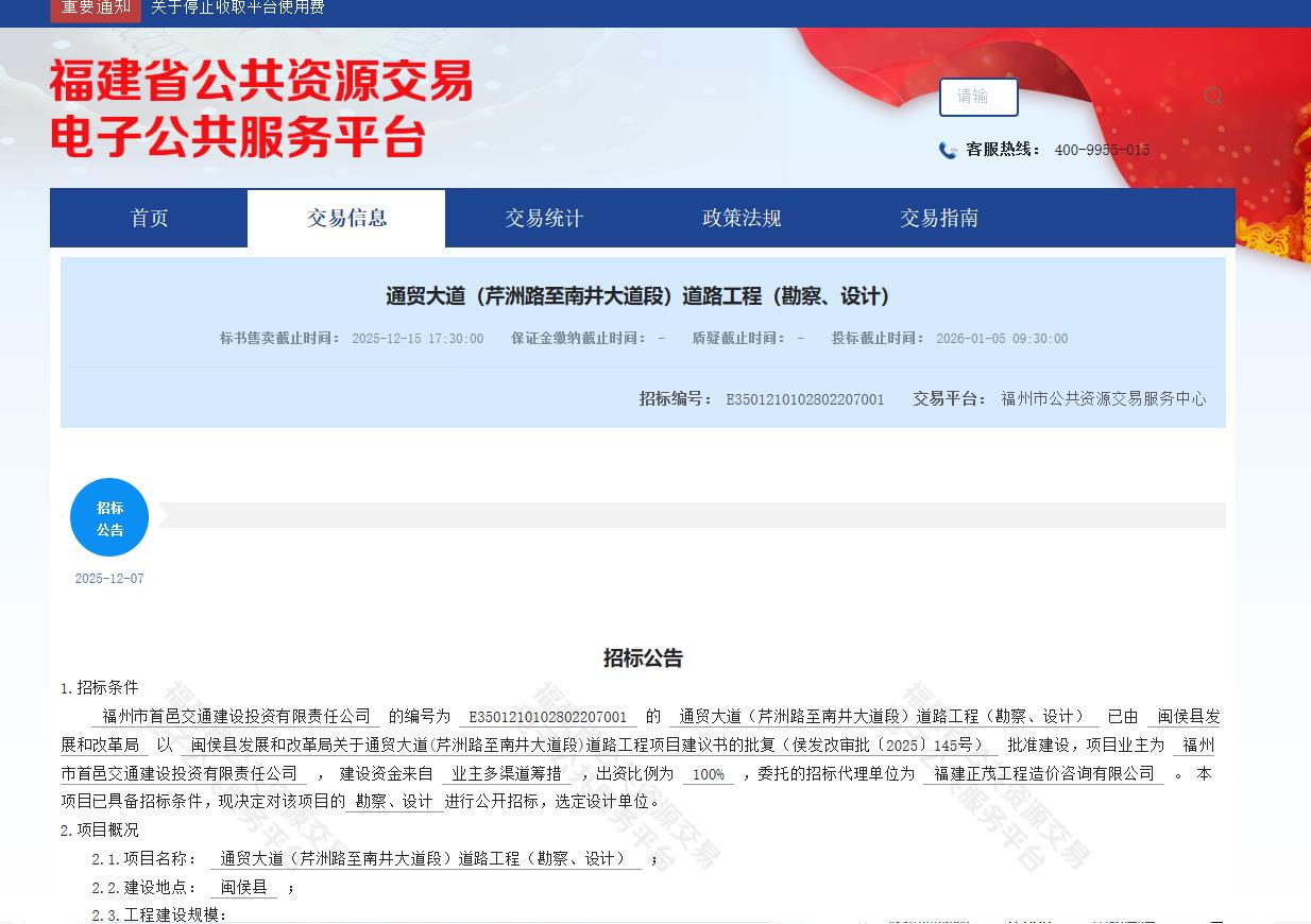 12月7日,福州市公共资源交易服务中心发布“通贸大道(芹洲路至南井大道段)道路工程(勘察、设计)”