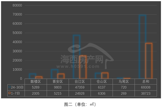 “仓山区”和“晋安区”位居二、三两位,上周分别签约6306㎡和5215㎡,环比前一周一涨一跌。